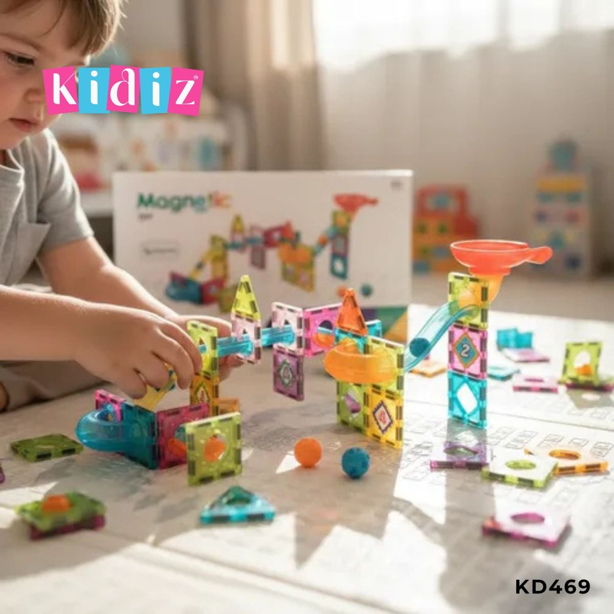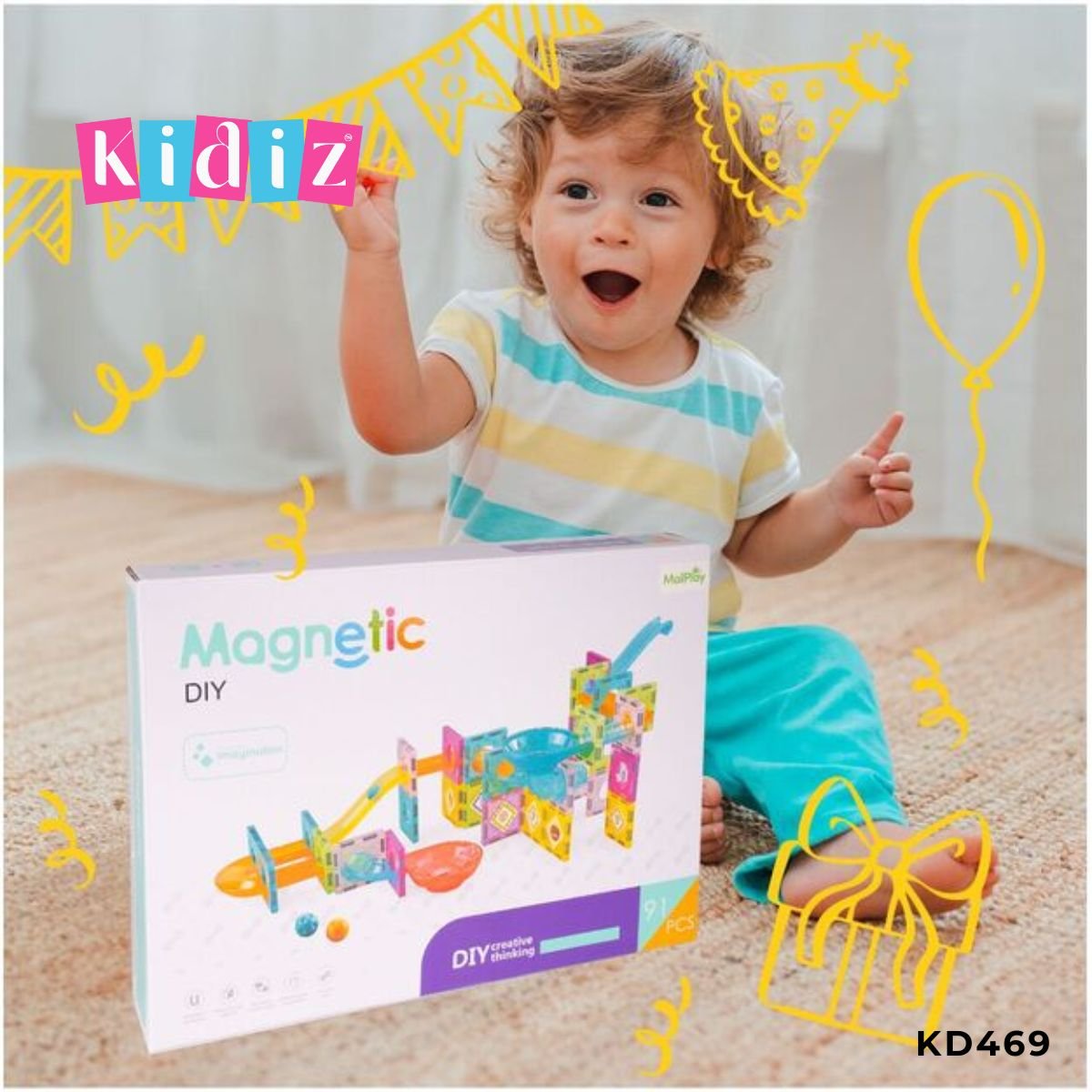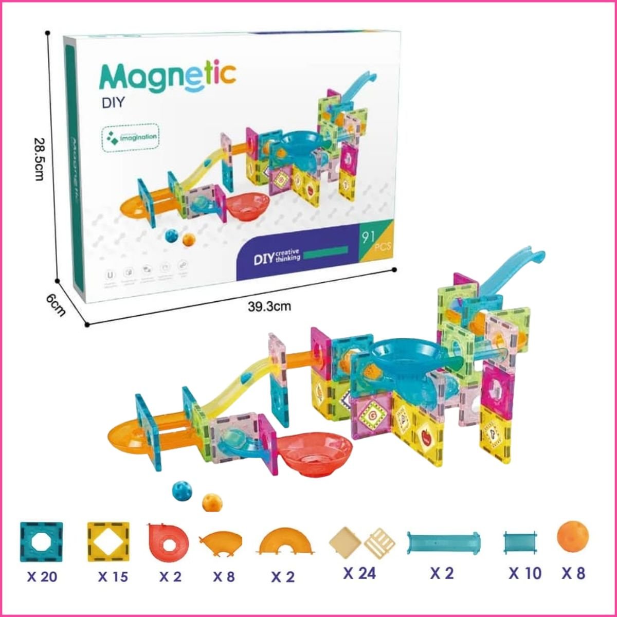 Créativité sans limites : Grâce aux 91 éléments inclus, les enfants peuvent assembler des tours géantes, des tunnels en zigzag et des toboggans aux formes variées. Les panneaux magnétiques s’emboîtent intuitivement pour des constructions stables.