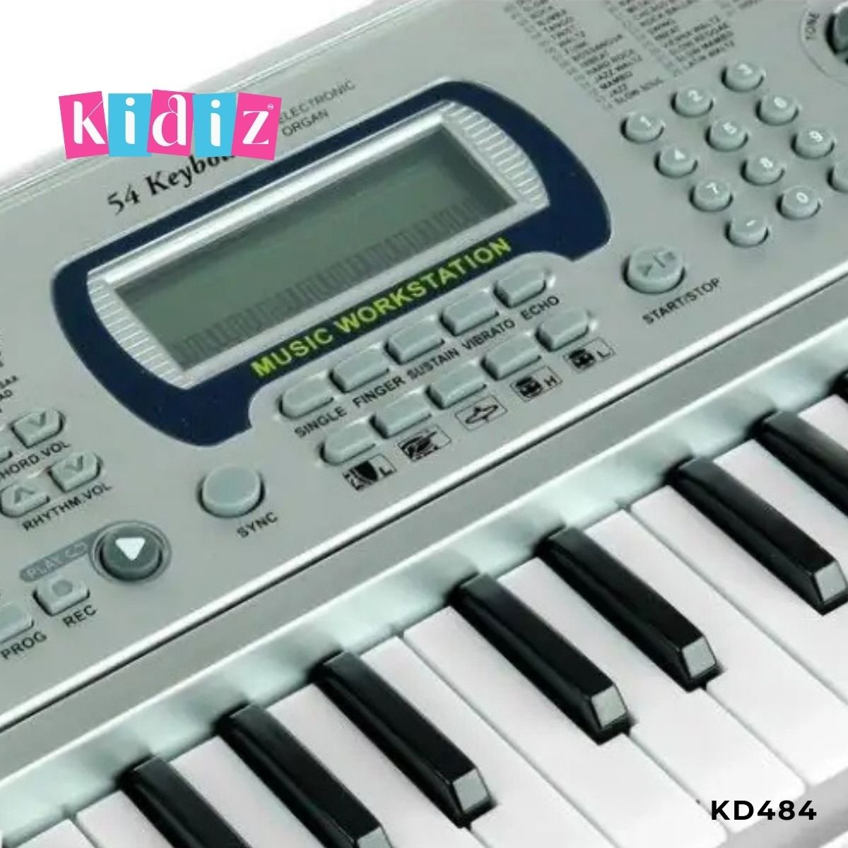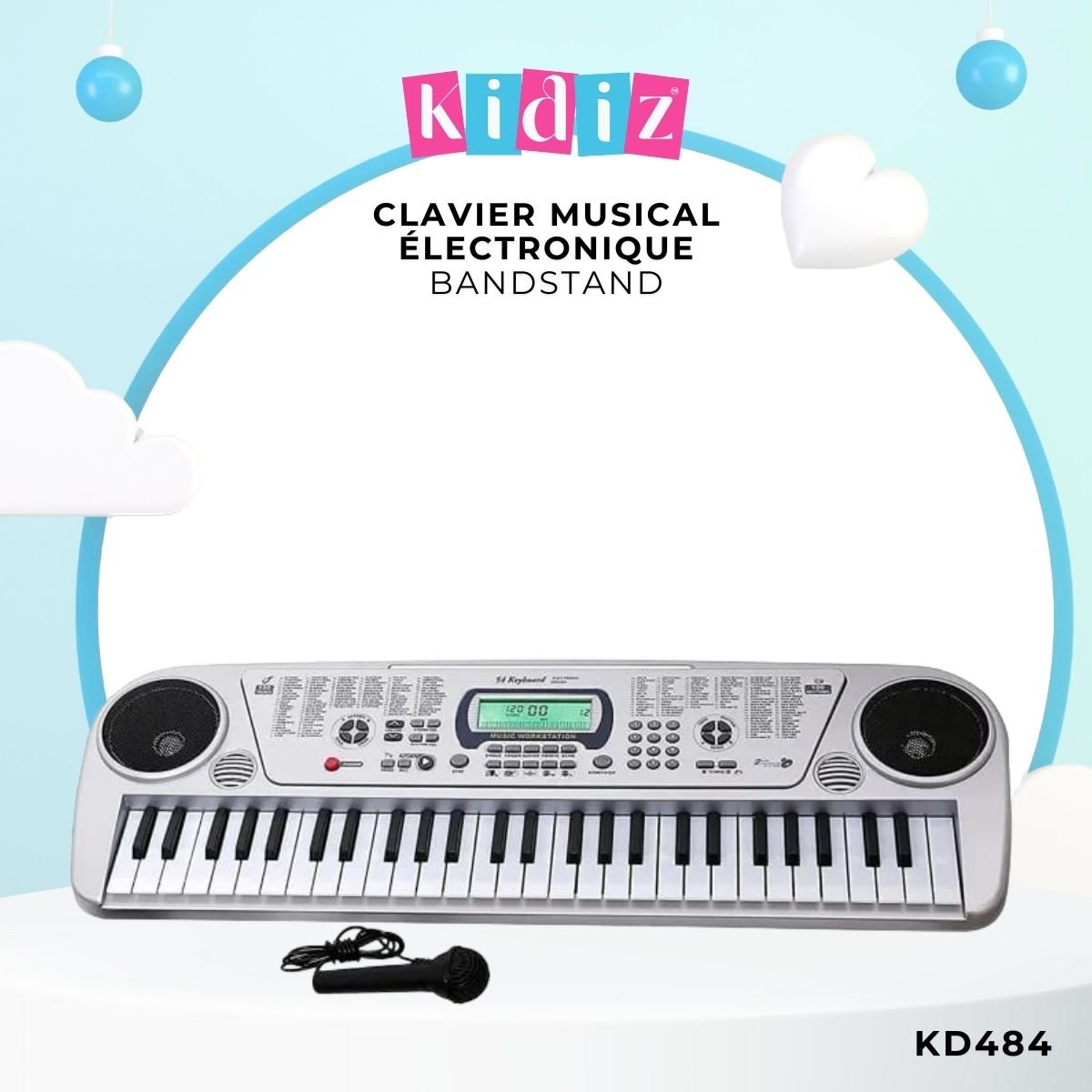 Clavier complet de 54 touches avec 100 sonorités, 100 rythmes, micro et fonctions d’apprentissage pour débuter et composer facilement.