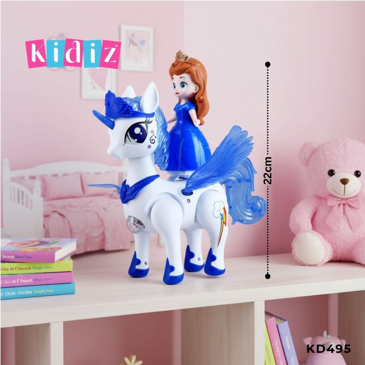 Design Royal : L’ensemble se distingue par ses finitions soignées : une licorne ailée blanche aux détails bleu royal, une corne scintillante et une queue transparente élégante.
