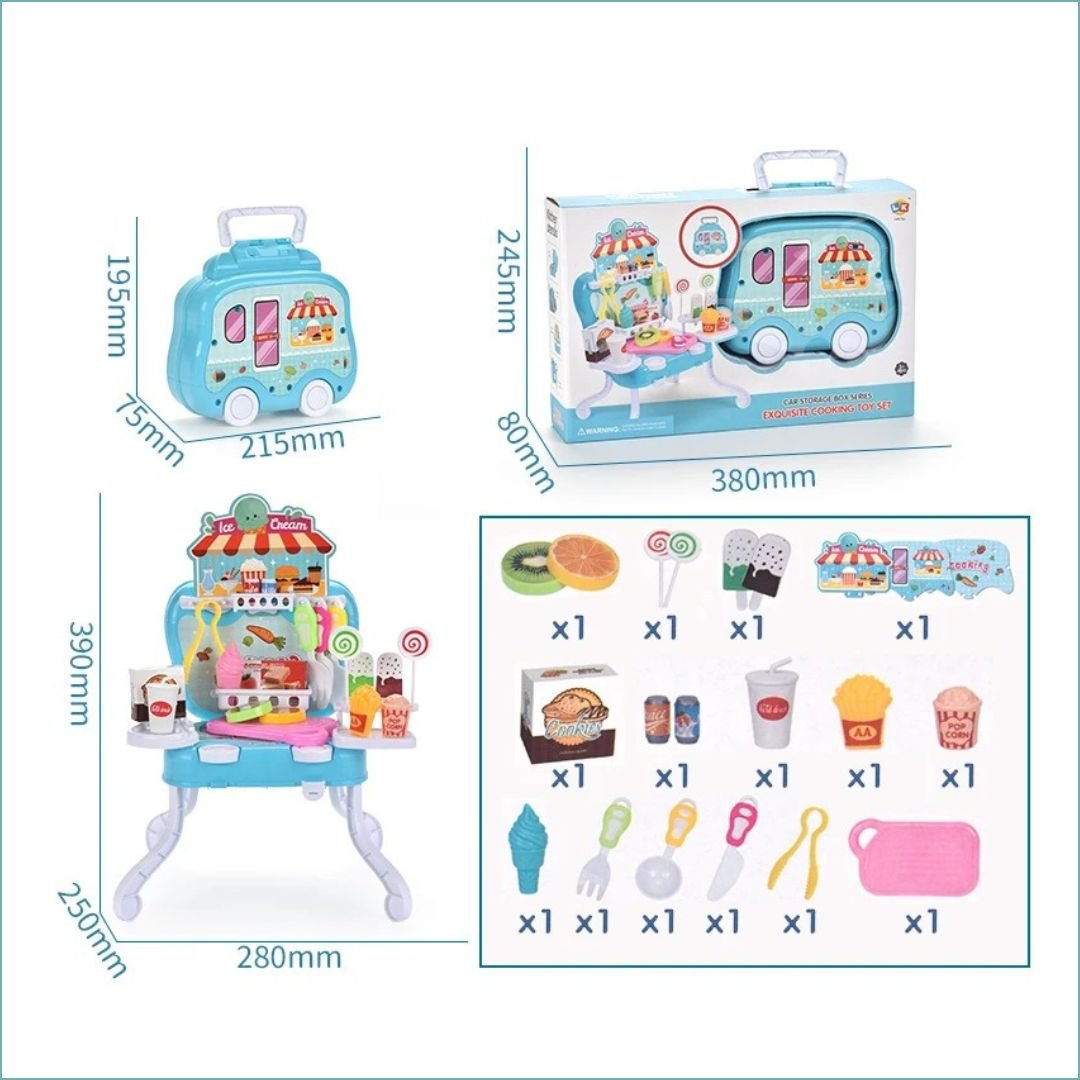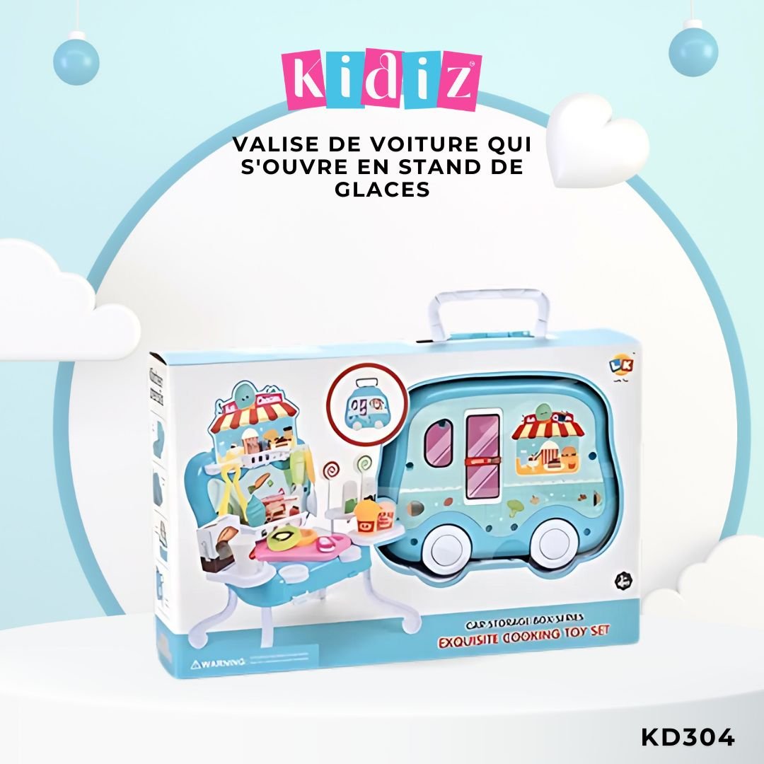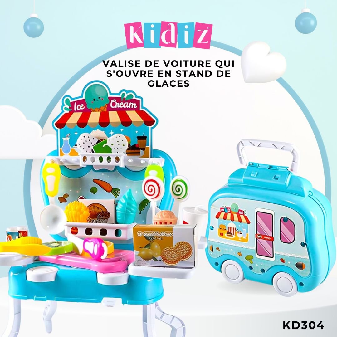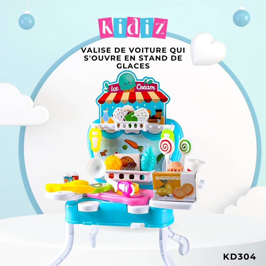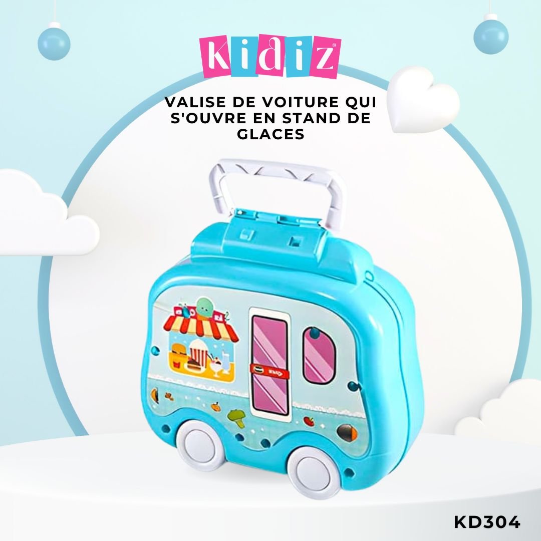 Cette valise de voiture se transforme en un véritable stand de glaces, pour des heures de jeu imaginatif ! Facile à transporter grâce à sa poignée et son format compact, elle permet aux enfants de l’emporter partout. Une fois ouverte, elle se déploie rapidement pour devenir un petit stand coloré et ludique, parfait pour jouer au vendeur de glaces.